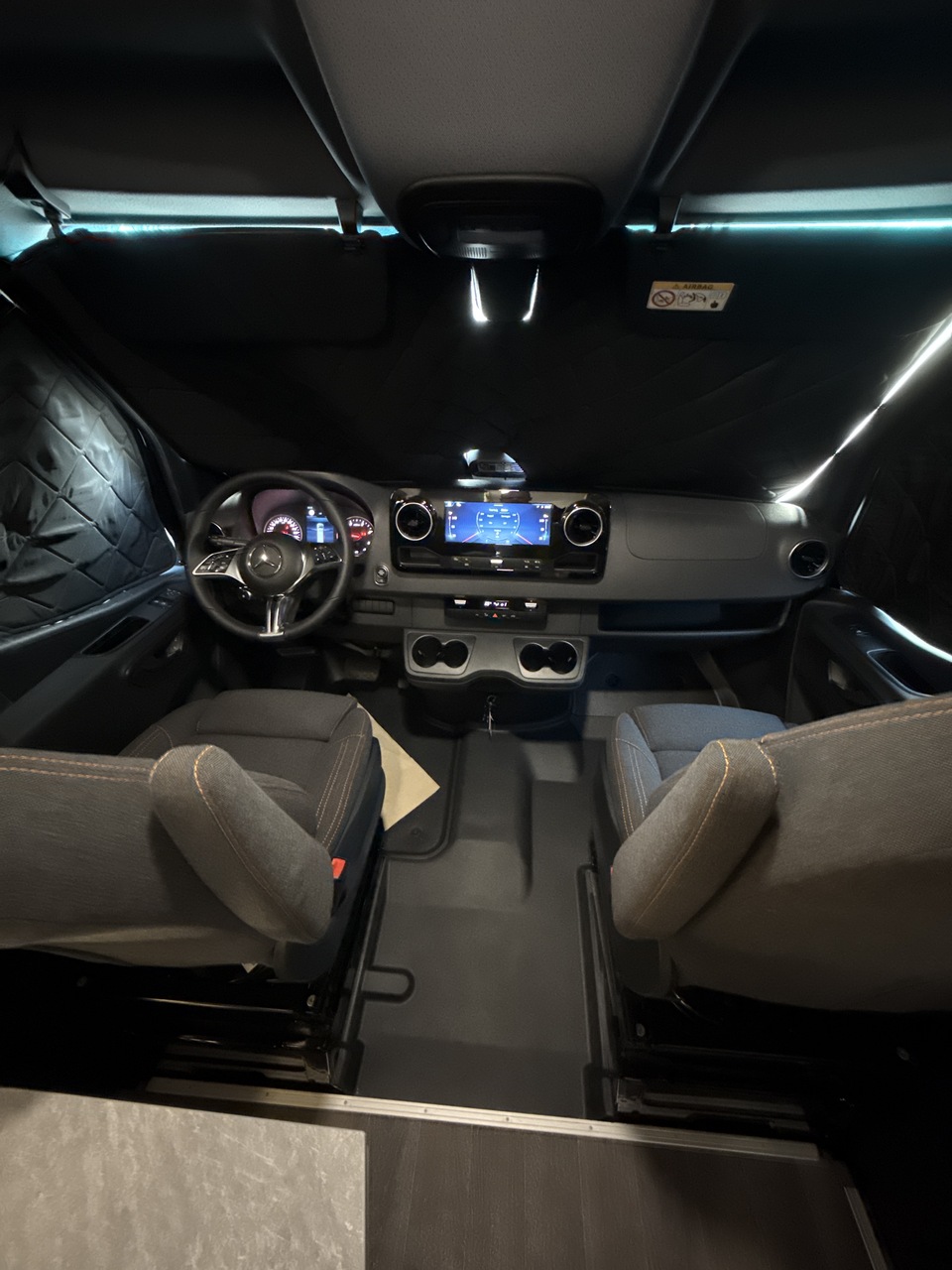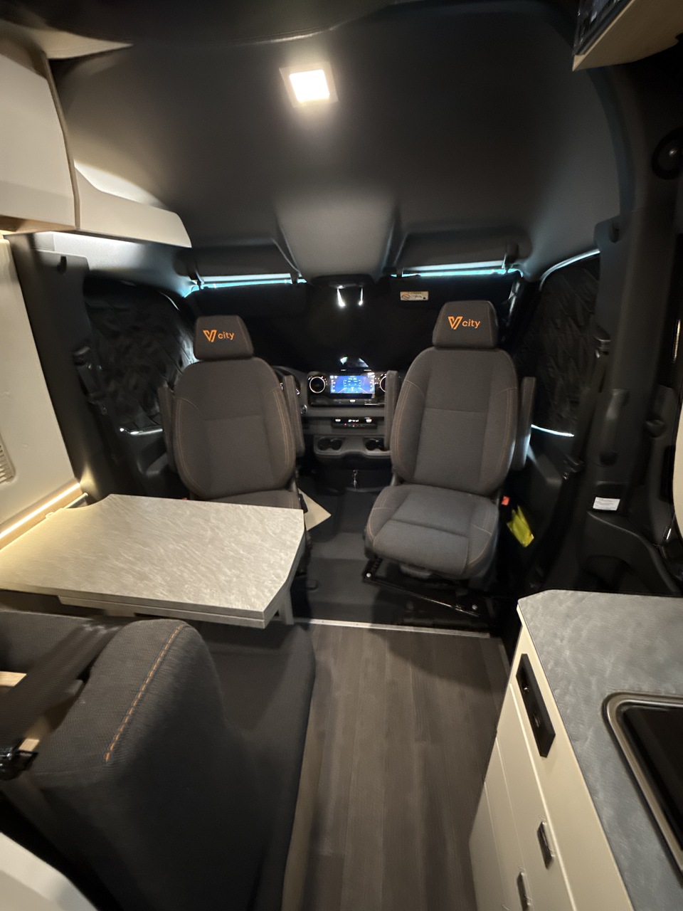 Eigentijds stoffen interieur design met V-city logo in de hoofdsteunen
